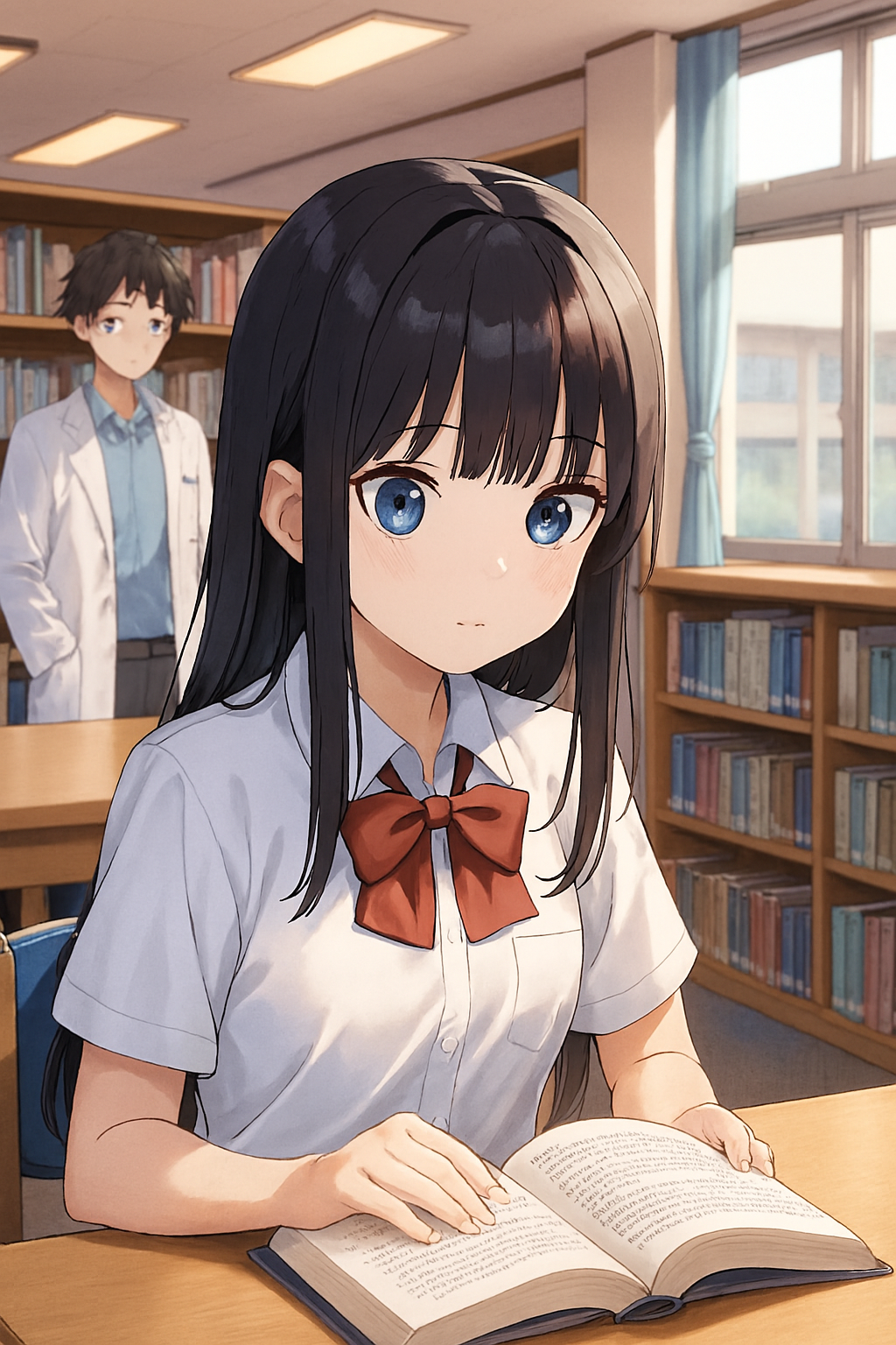 詠唱詞: Generate a Japanese anime style scene. The scene was in the school lib. A student was reading. The student's appearance is chest-length straight black hair, flat bangs, and blue eyes. A male student wearing a white lab uniform.